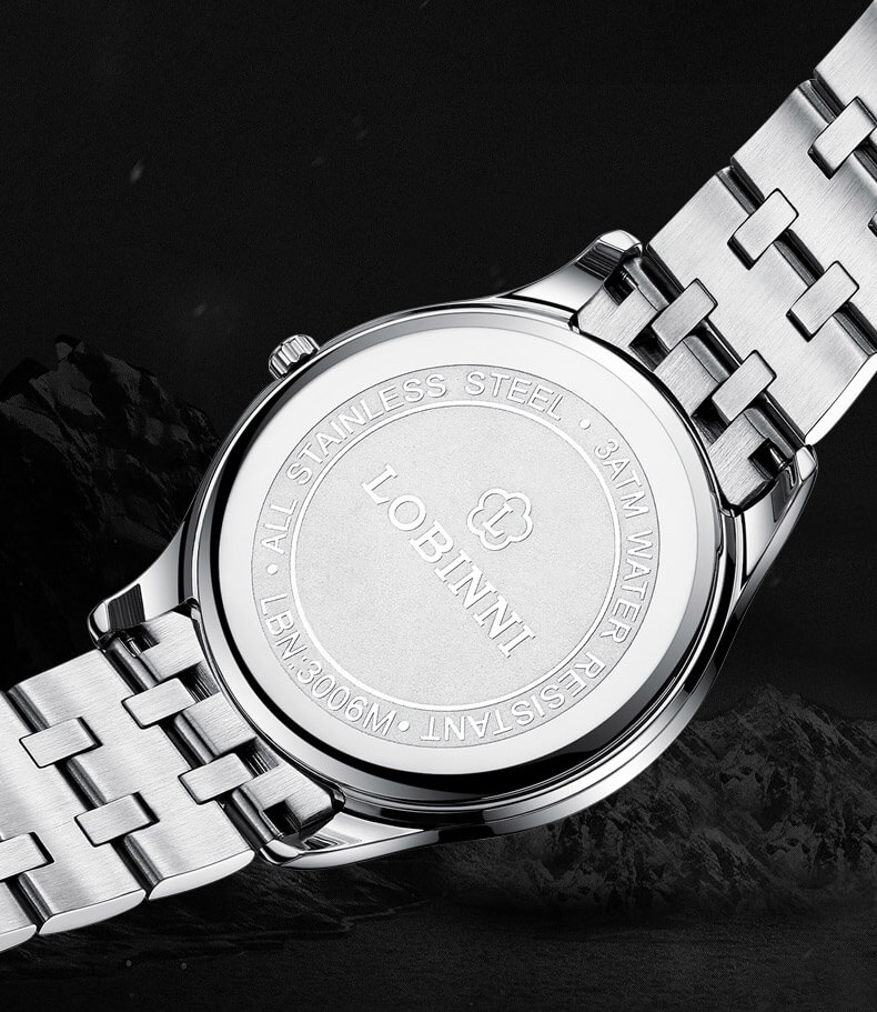 Mặt đáy chiếc Lobinni L3006 này được đánh vân và khắc dập các thông số cơ bản của nó, chính giữa là hình ảnh logo và dòng chữ “Lobinni”. Có thể thấy, sự tinh tế, sắc nét là không thể nào chối cãi ở tác phẩm này.
