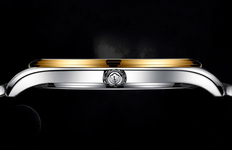 Cỗ máy được trang bị kính Sapphire nguyên khối nên chống xước cực tốt. Toàn bộ dây được làm từ thép không gỉ 316L, riêng hai đường chỉ ở giữa và viền mặt số được mạ vàng PVD sáng bền theo thời gian.
