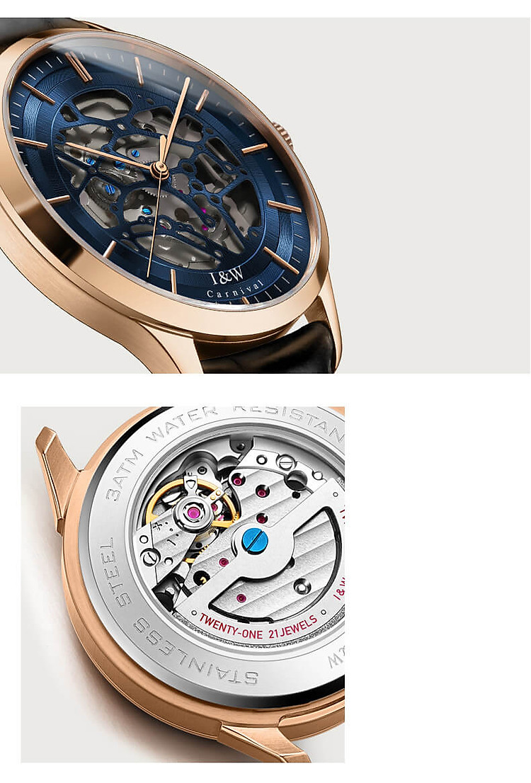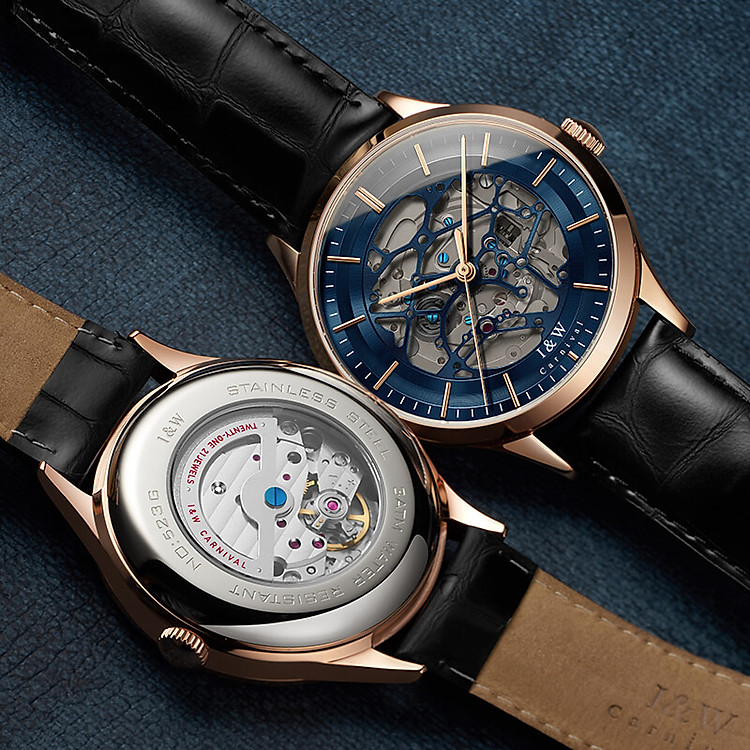 Đồng hồ nam chính hãng I&W 524G1 có thiết kế Skeleton tinh xảo có 1-0-2 phô diễn những tinh túy của nghệ thuật cơ khí phức tạp ở cả mặt trước và sau. Để lộ ra hàng trăm chi tiết máy, những bánh răng, dây tóc cùng sắc tím của những viên chân kính mang vẻ đẹp mê hồn, khó cưỡng như một nhà máy sản xuất thời gian thu nhỏ.