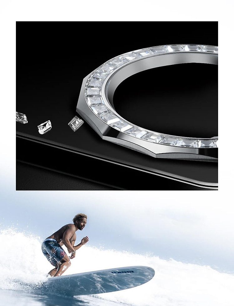 Mặt số được chia thành các đường kẻ bằng nhau, tạo ra một cảm giác độc đáo phá cách. Viền mặt đồng hồ được đính đá lấp lánh, tạo điểm nhấn lộng lẫy và thu hút ánh nhìn từ mọi góc độ.