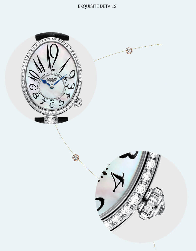 Đồng hồ nữ chính hãng Kassaw Thụy Sỹ Thiết kế hiện đại,sang trọng dành cho phái nữ Thời gian trữ cót lâu lên đến gần 38h Chống nước 5ATM, Kính sapphire Toàn bộ máy được làm từ thép không gỉ 316L Đồng hồ cơ Automatic, Sử dụng bộ máy Seiko Nh35A và máy Miyota 8215 Chính hãng