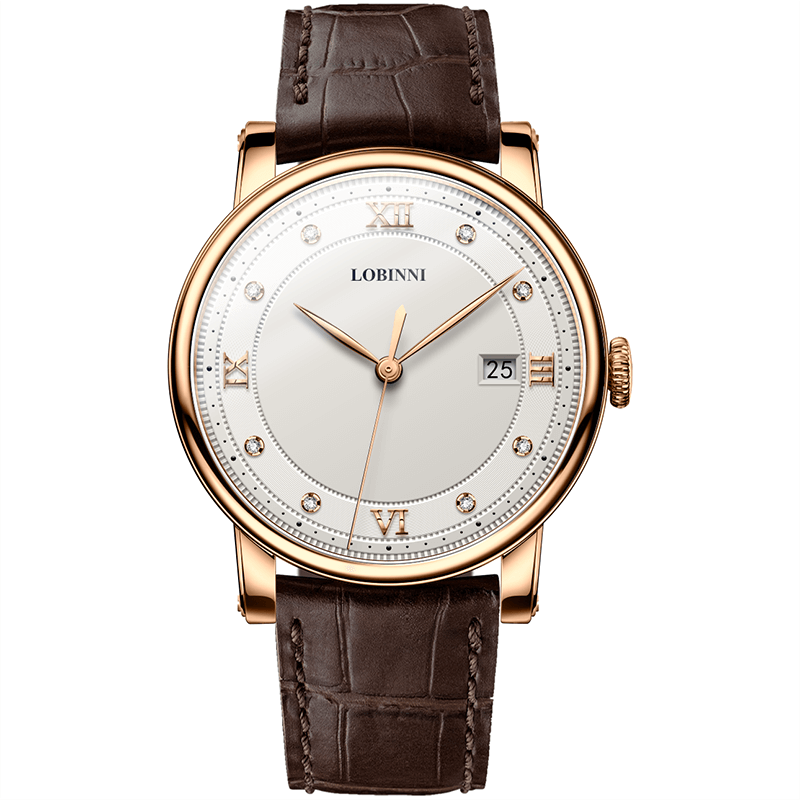 - Phần mặt số được làm tối giản và mang hơi hướng cổ điển với bộ kim thanh mảnh và được mạ vàng hồng PVD . Ô cửa sổ lịch ngày được đặt ở góc 3 giờ cũng mang phong cách truyền thống, thường thấy trên những mẫu đồng hồ Classic. Cách phối màu trên Lobinni L3012-11 cũng rất cơ bản với hai màu trắng và vàng hồng bởi phần vỏ làm từ thép không gỉ 316L và dây đeo bằng da nâu mềm mại.