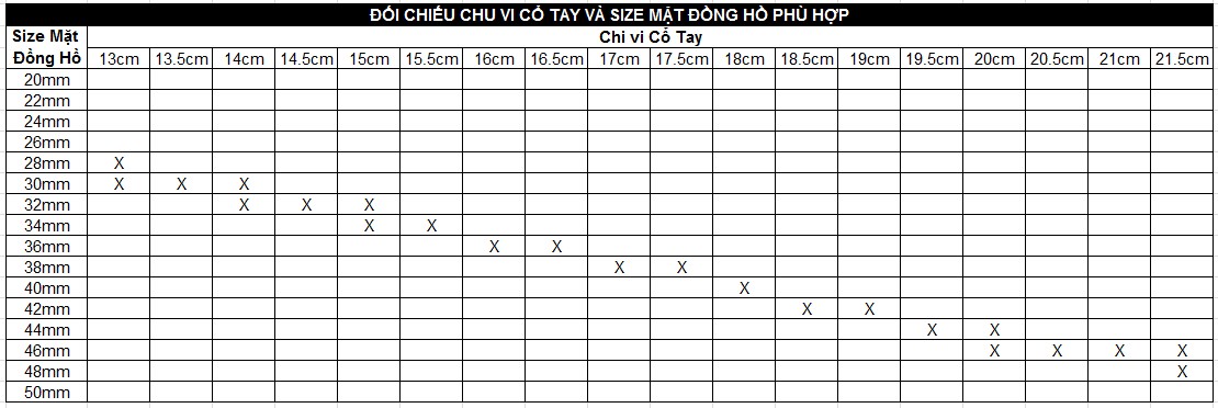 Để biết chính xác mặt đồng hồ có vừa vặn với cổ tay bạn hay không, cách tốt nhất là bạn đo chu vi cổ tay và cung cấp cho shop thông số của bạn, hoặc bạn có thể đối chiếu thông số với bảng bên dưới