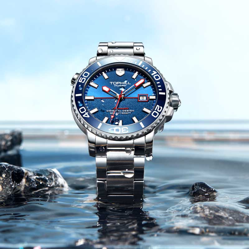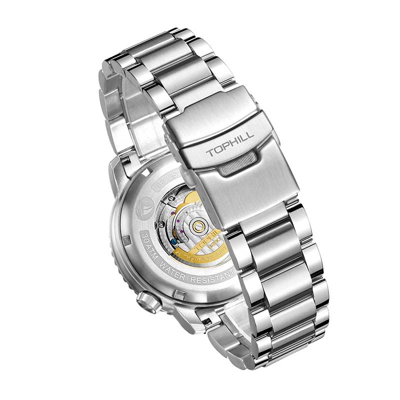 Đồng hồ Tophill TD003G là sản phẩm cao cấp được sản xuất bởi thương hiệu đồng hồ Thụy Sĩ Tophill do công ty Trần Đức nhập khẩu và phân phối duy toàn thị trường Việt Nam. Chất liệu được sử dụng từ những chất liệu cao cấp nhất trong chế tác đồng hồ như thép không gỉ 316L, kính sapphire chống trầy xước và bộ máy automatic mạnh mẽ, độ chính xác cao. Mức chịu nước tối đa lên tới 300m dùng đi bơi, tắm hồ, lặn biển, đi mưa, rửa rất thoải mái và yên tâm.