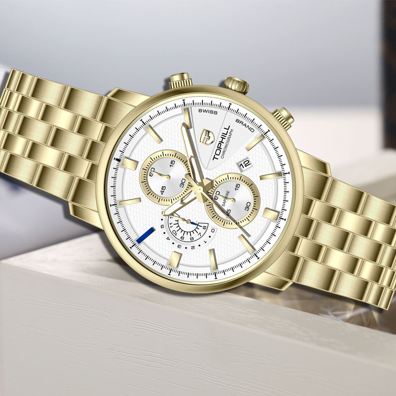 Đồng hồ Tophill TL022G là sản phẩm cao cấp được sản xuất bởi thương hiệu đồng hồ Thụy Sĩ Tophill do công ty Trần Đức nhập khẩu và phân phối duy toàn thị trường Việt Nam. Chất liệu được sử dụng từ những chất liệu cao cấp nhất trong chế tác đồng hồ như thép không gỉ 316L, kính sapphire chống trầy xước và bộ máy pin mạnh mẽ, độ chính xác cao. Mức chịu nước tối đa lên tới 50m dùng đi mưa, rửa rất thoải mái và yên tâm.