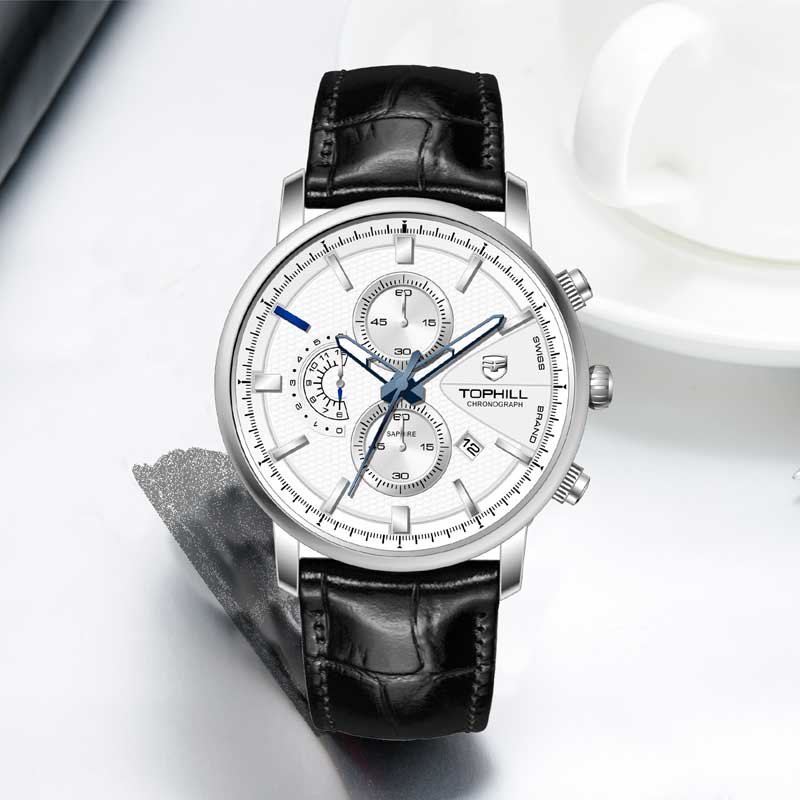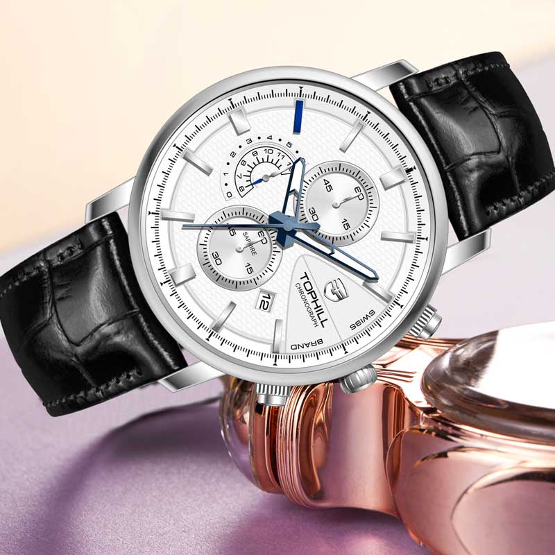 Đồng hồ Tophill TW082G là sản phẩm cao cấp được sản xuất bởi thương hiệu đồng hồ Thụy Sĩ Tophill do công ty Trần Đức nhập khẩu và phân phối duy toàn thị trường Việt Nam. Chất liệu được sử dụng từ những chất liệu cao cấp nhất trong chế tác đồng hồ như thép không gỉ 316L, dây da cao cấp, kính sapphire chống trầy xước và bộ máy pin mạnh mẽ, độ chính xác cao. Mức chịu nước tối đa lên tới 50m dùng đi mưa, rửa rất thoải mái và yên tâm.