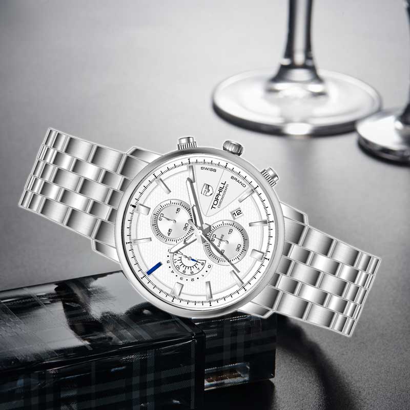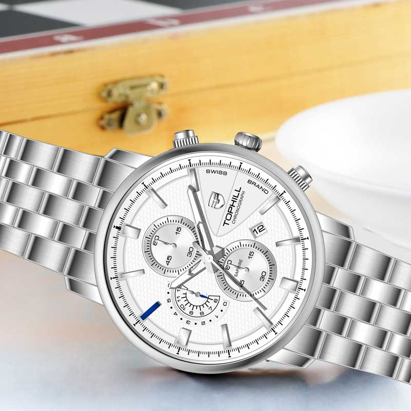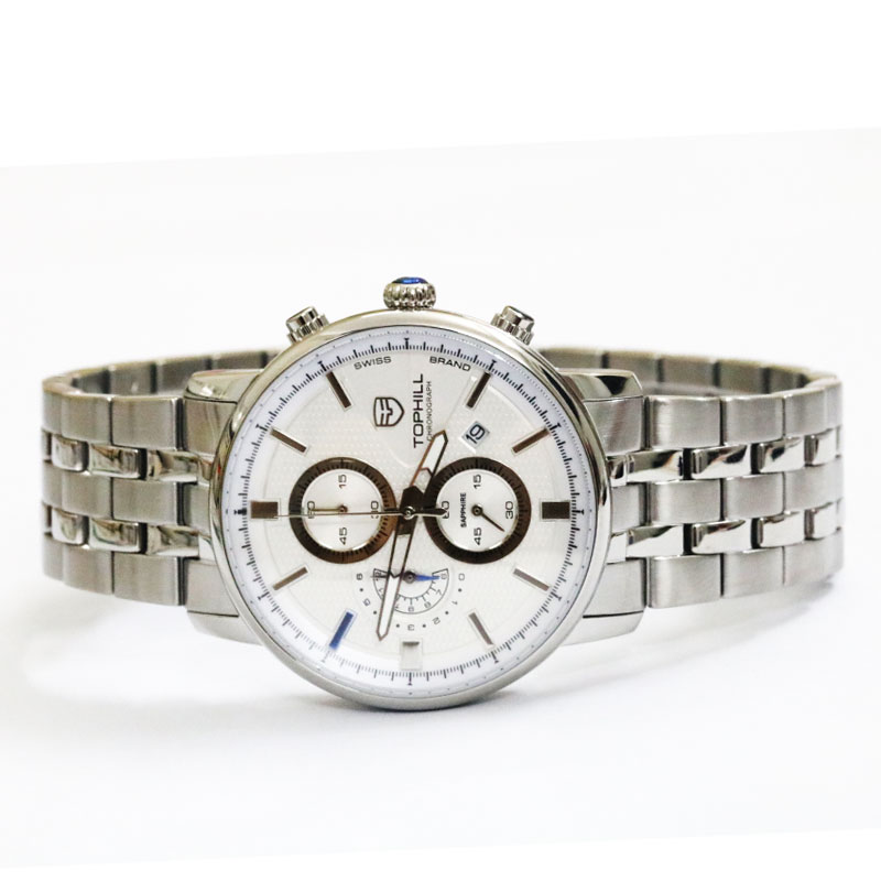 Đồng hồ Tophill TW082G là sản phẩm cao cấp được sản xuất bởi thương hiệu đồng hồ Thụy Sĩ Tophill do công ty Trần Đức nhập khẩu và phân phối duy toàn thị trường Việt Nam. Chất liệu được sử dụng từ những chất liệu cao cấp nhất trong chế tác đồng hồ như thép không gỉ 316L, kính sapphire chống trầy xước và bộ máy pin mạnh mẽ, độ chính xác cao. Mức chịu nước tối đa lên tới 50m dùng đi mưa, rửa rất thoải mái và yên tâm.