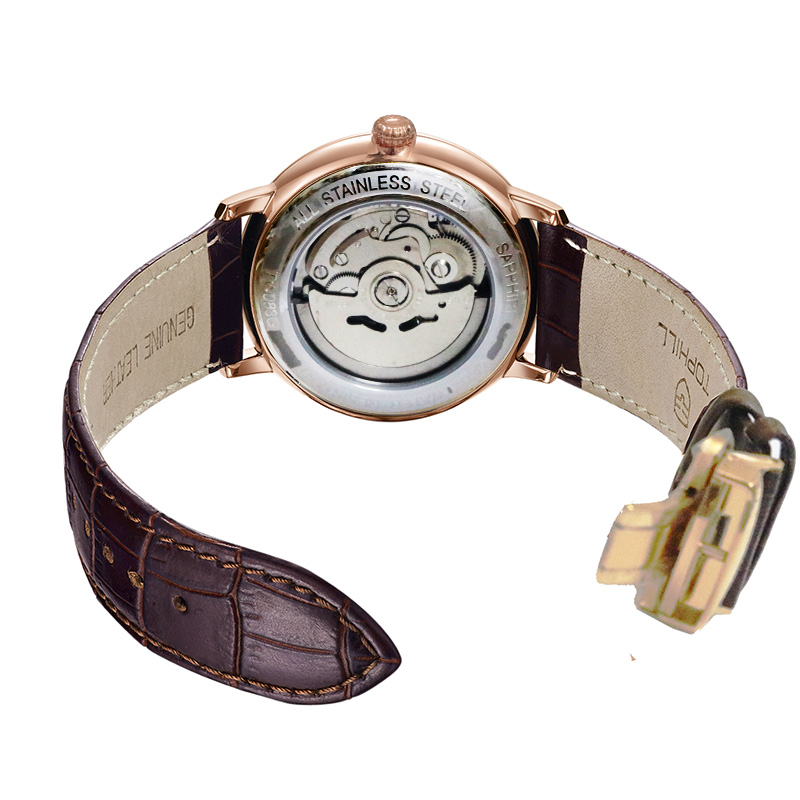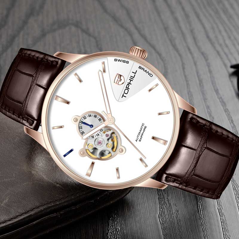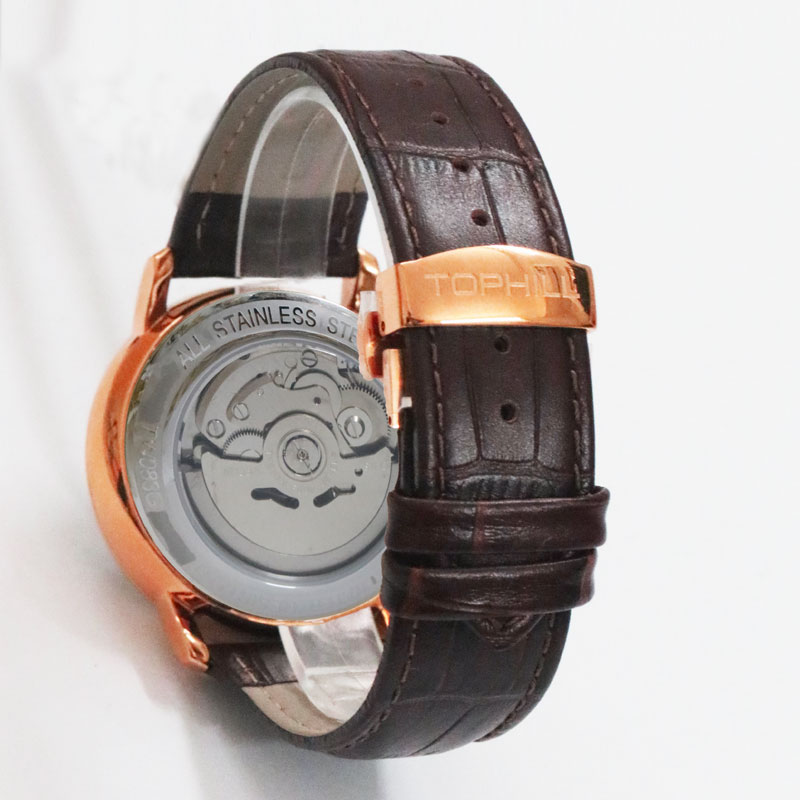 Đồng hồ Tophill TW083G là sản phẩm cao cấp được sản xuất bởi thương hiệu đồng hồ Thụy Sĩ Tophill do công ty Trần Đức nhập khẩu và phân phối duy toàn thị trường Việt Nam. Chất liệu được sử dụng từ những chất liệu cao cấp nhất trong chế tác đồng hồ như thép không gỉ 316L, dây da cao cấp, kính sapphire chống trầy xước và bộ máy automatic mạnh mẽ, độ chính xác cao. Mức chịu nước tối đa lên tới 50m dùng đi mưa, rửa rất thoải mái và yên tâm.