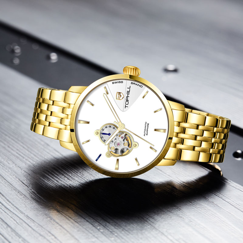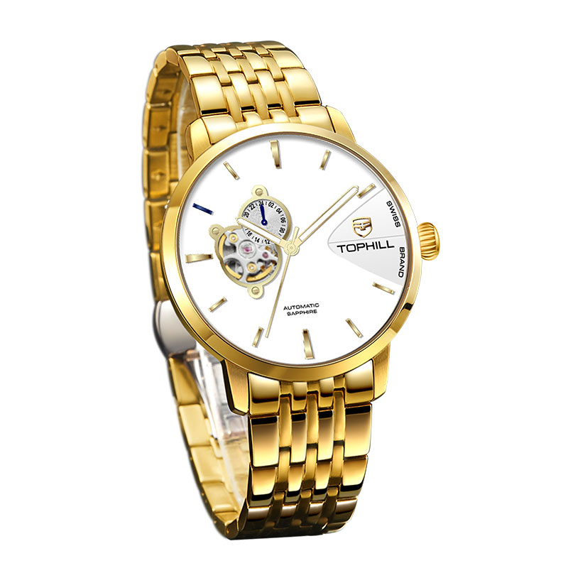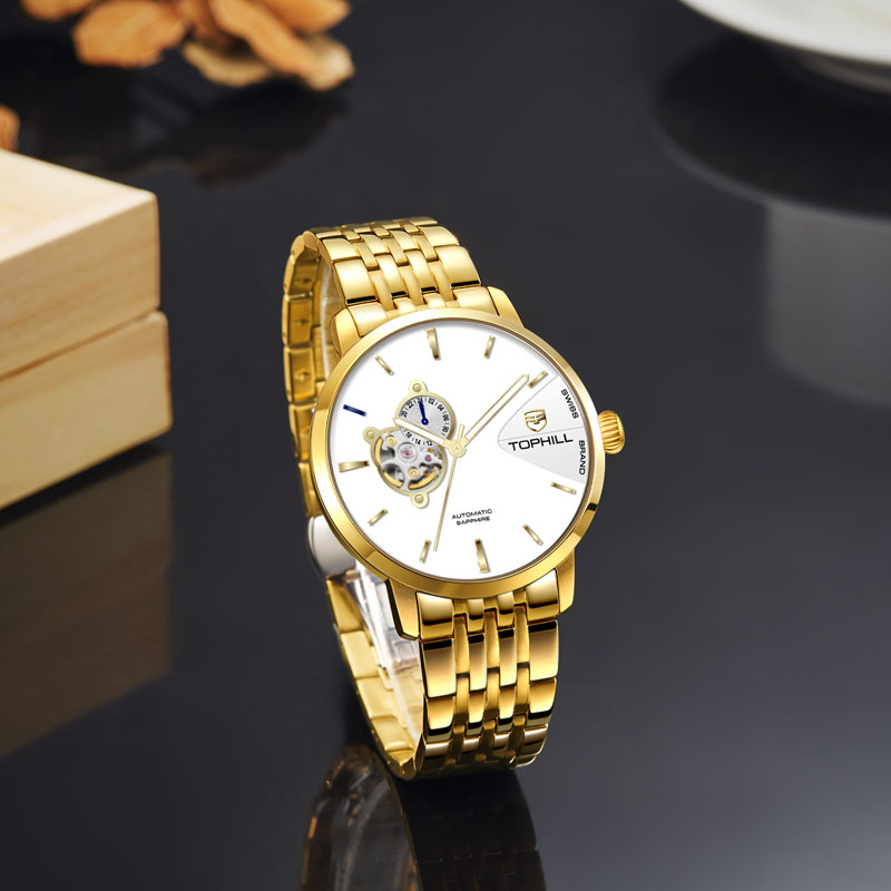 Đồng hồ Tophill TW083G là sản phẩm cao cấp được sản xuất bởi thương hiệu đồng hồ Thụy Sĩ Tophill do công ty Trần Đức nhập khẩu và phân phối duy toàn thị trường Việt Nam. Chất liệu được sử dụng từ những chất liệu cao cấp nhất trong chế tác đồng hồ như thép không gỉ 316L, dây da cao cấp, kính sapphire chống trầy xước và bộ máy automatic mạnh mẽ, độ chính xác cao. Mức chịu nước tối đa lên tới 50m dùng đi mưa, rửa rất thoải mái và yên tâm.