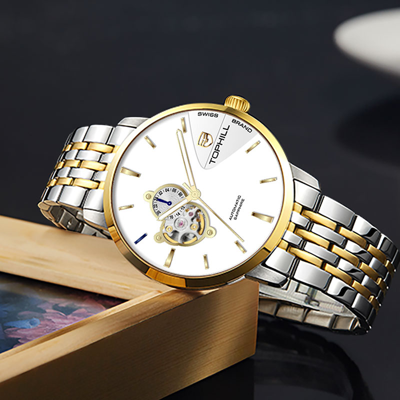 Đồng hồ Tophill TW083G là sản phẩm cao cấp được sản xuất bởi thương hiệu đồng hồ Thụy Sĩ Tophill do công ty Trần Đức nhập khẩu và phân phối duy toàn thị trường Việt Nam. Chất liệu được sử dụng từ những chất liệu cao cấp nhất trong chế tác đồng hồ như thép không gỉ 316L, dây da cao cấp, kính sapphire chống trầy xước và bộ máy automatic mạnh mẽ, độ chính xác cao. Mức chịu nước tối đa lên tới 50m dùng đi mưa, rửa rất thoải mái và yên tâm.