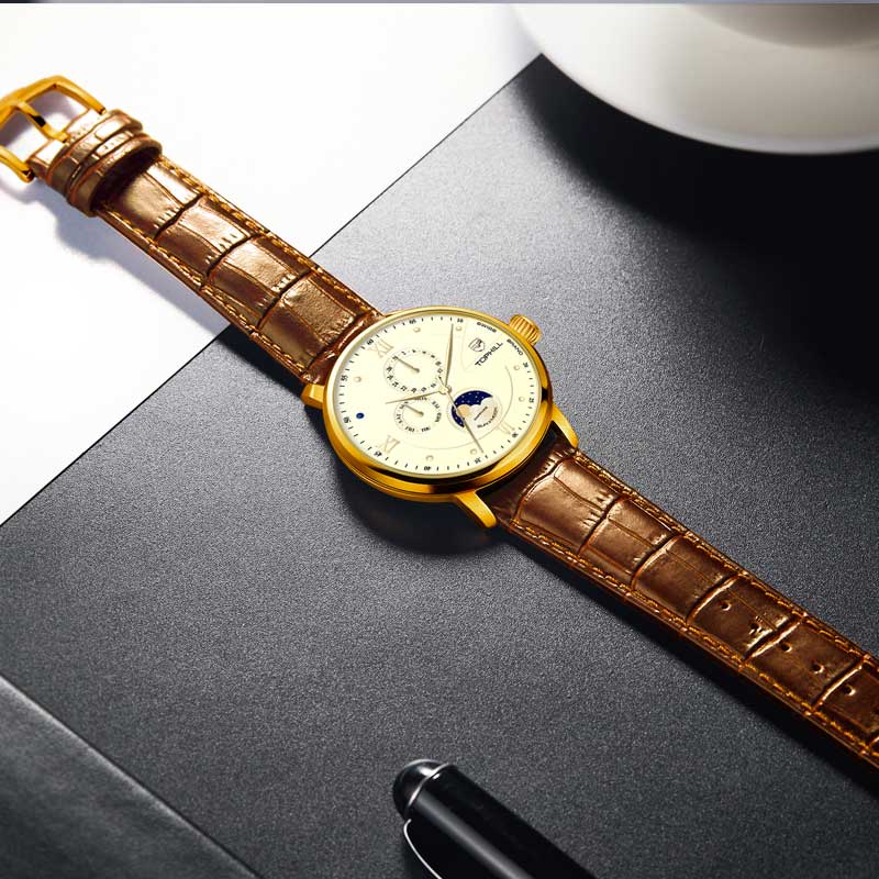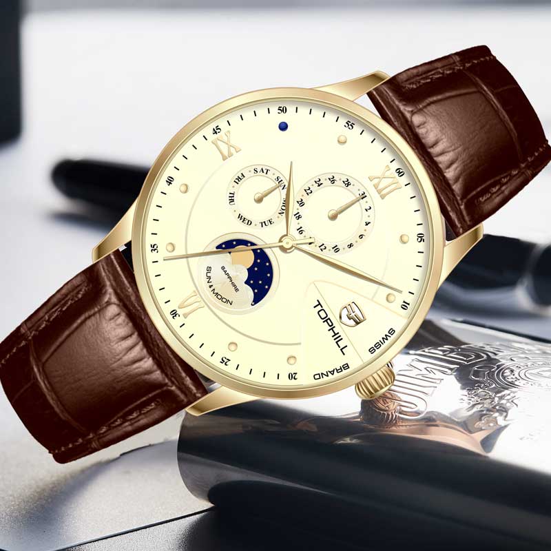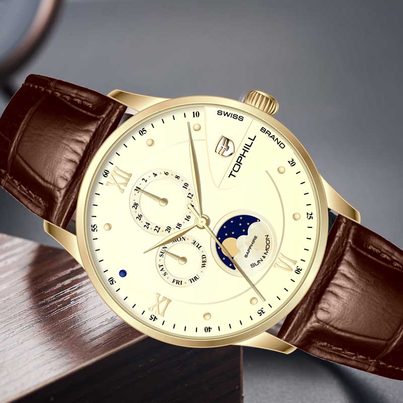 Đồng hồ Tophill TW085G là sản phẩm cao cấp được sản xuất bởi thương hiệu đồng hồ Thụy Sĩ Tophill do công ty Trần Đức nhập khẩu và phân phối duy toàn thị trường Việt Nam. Chất liệu được sử dụng từ những chất liệu cao cấp nhất trong chế tác đồng hồ như thép không gỉ 316L, dây da cao cấp, kính sapphire chống trầy xước và bộ máy pin mạnh mẽ, độ chính xác cao. Mức chịu nước tối đa lên tới 50m dùng đi mưa, rửa rất thoải mái và yên tâm.
