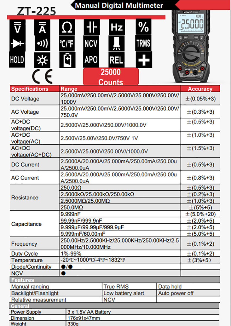 Đồng hồ vạn năng kỹ thuật số ABG ZOYI ZT-225 tự động độ chính xác cao, công cụ tối ưu cho việc bảo trì và kiểm tra điện
