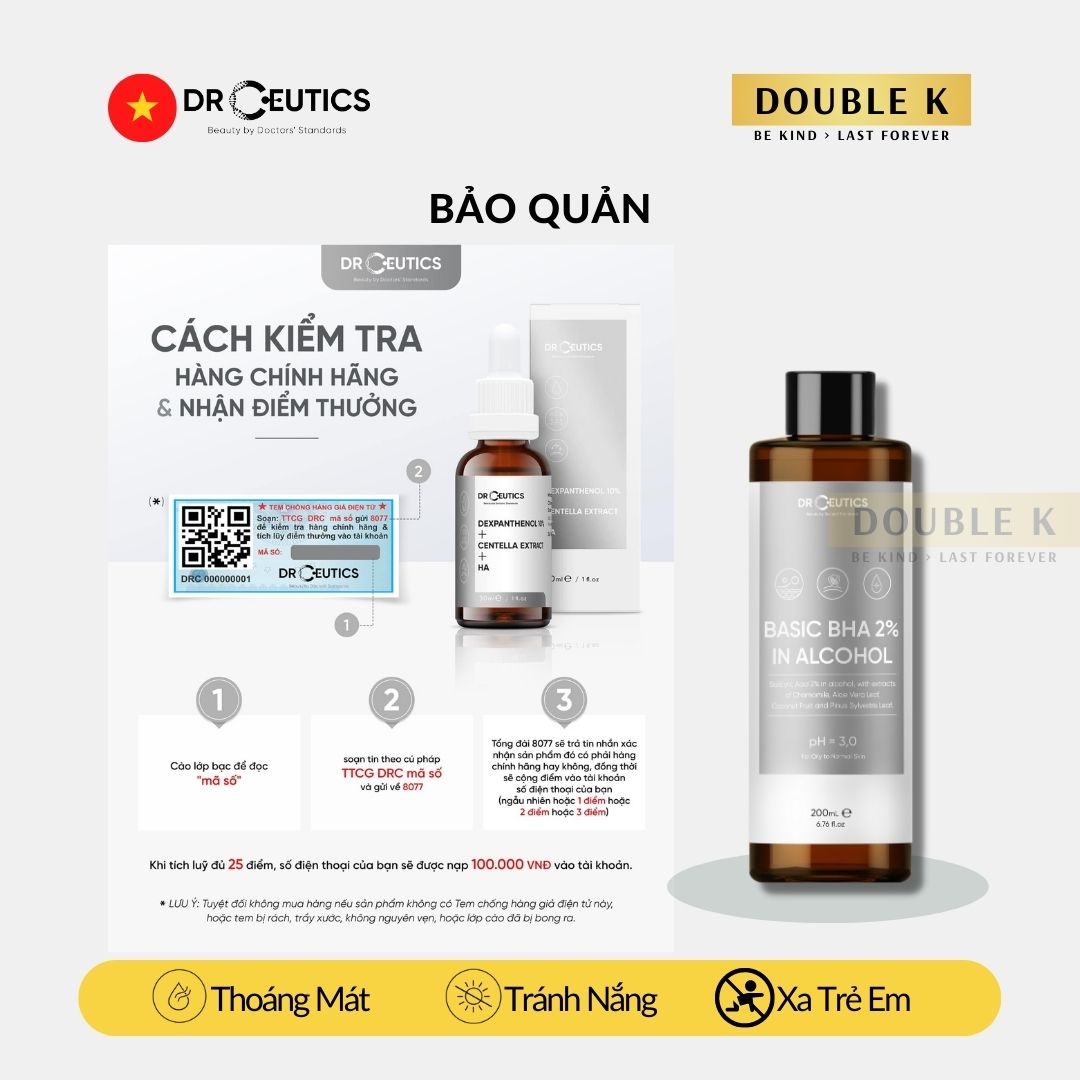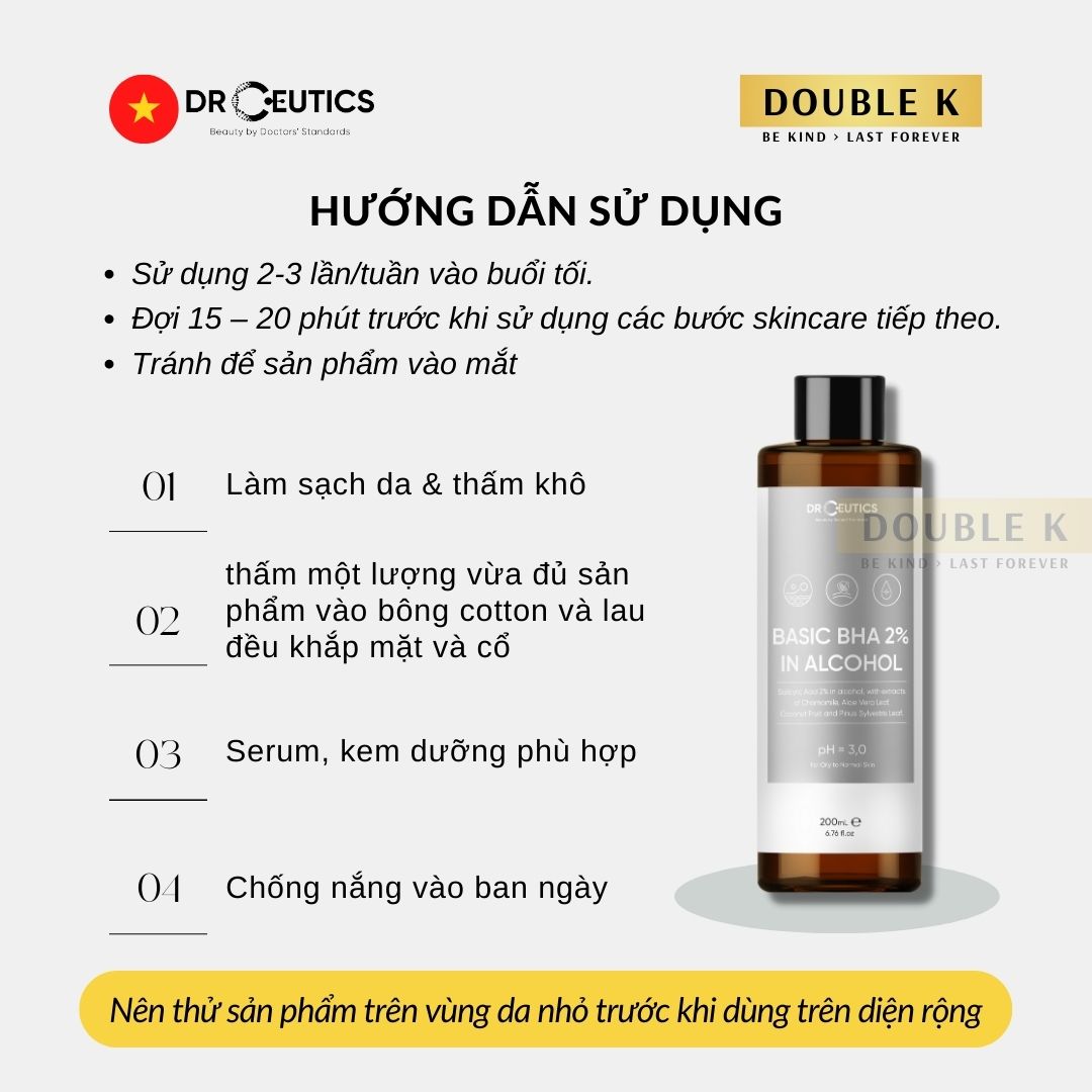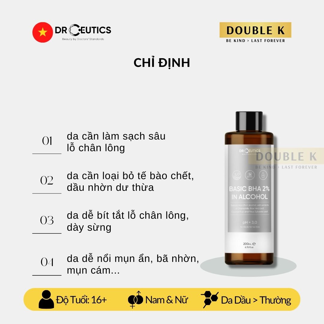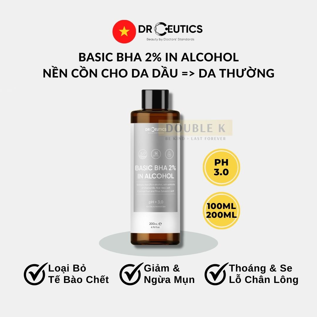 Basic BHA 2% In Alcohol (Nền Cồn) DrCeutics (pH 3.0) - phù hợp cho làn da dầu đến da thường; giúp làm sạch da, thông thoáng lỗ chân lông, đồng thời ngăn ngừa các vi khuẩn gây mụn, hỗ trợ các bước chăm sóc da tiếp theo đạt hiệu quả tốt.