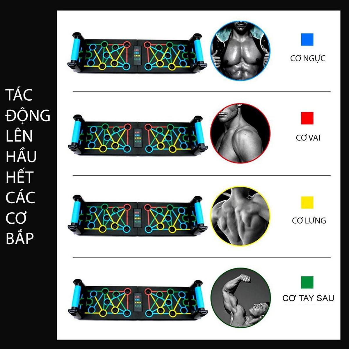 Dụng cụ tập Chống đẩy hít đất đa năng giúp Luyện tập các cơ: Cơ ngực, Cơ vai, Cơ lưng, Cơ tay sau với các vị trí được thể hiện trên bảng tập (có 4 màu chính: Xanh Lá, Xanh Dương, Vàng, Đỏ).