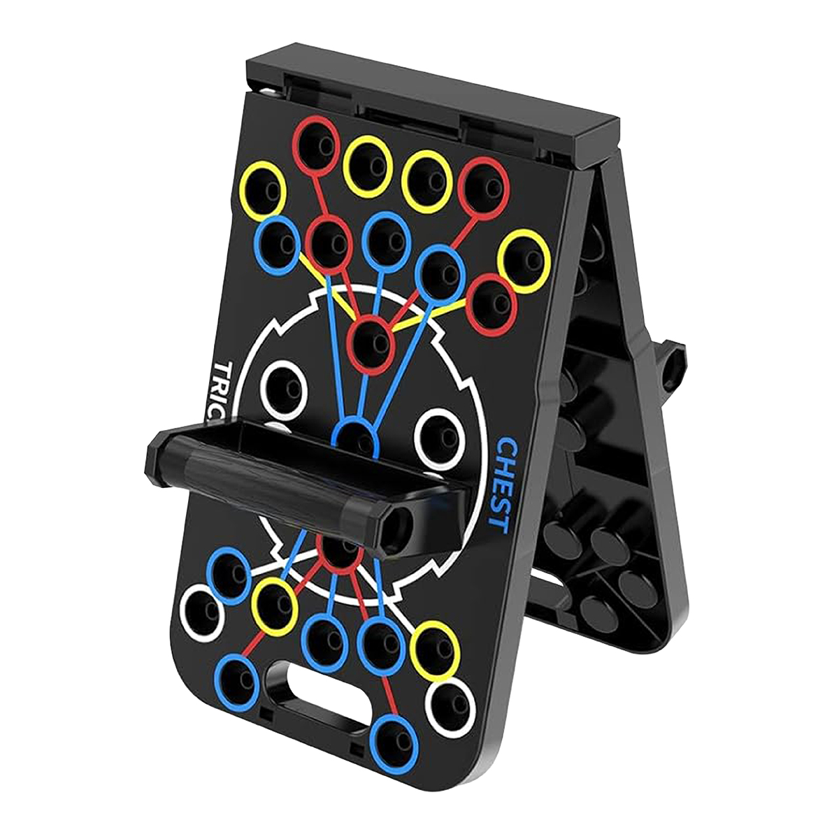 - Dụng cụ chống đẩy mã hóa màu khác nhau nhắm mục đích luyện tập thể dục cơ bắp cụ thể (đỏ cho vai, vàng cho lưng, xanh cho cơ tam đầu).