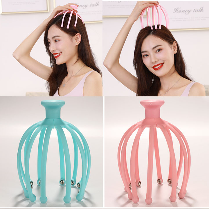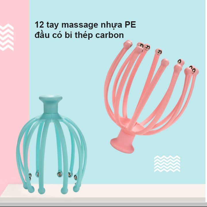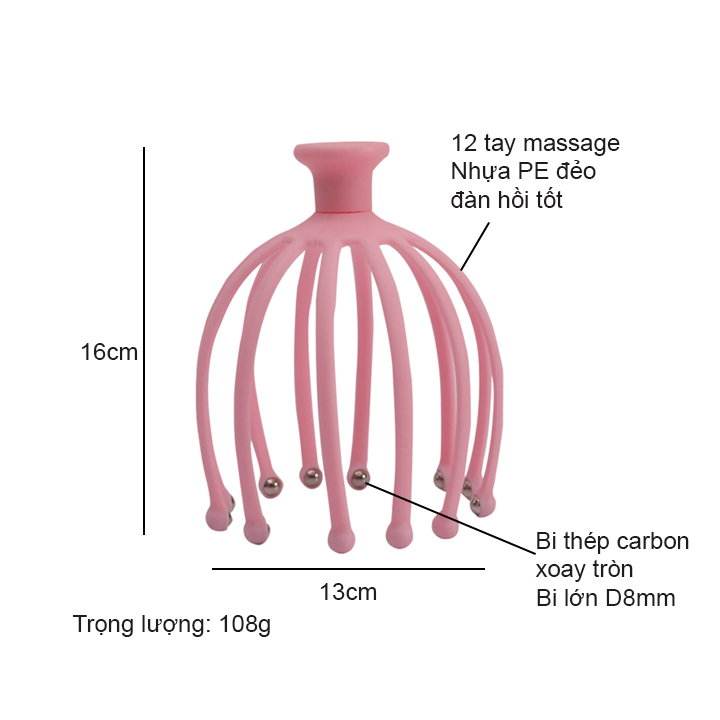 Dụng cụ Massage đầu được thiết ké thông minh, sáng tạo với 12 tay Massage bằng nhựa PE và có trang bị bi kích cỡ lớn 8mm bằng thép ở mỗ đầu tay Massage, các bi này xoay 360 độ giúp Massage hiệu quả, không ảnh hưởng tới da đầu hay tóc