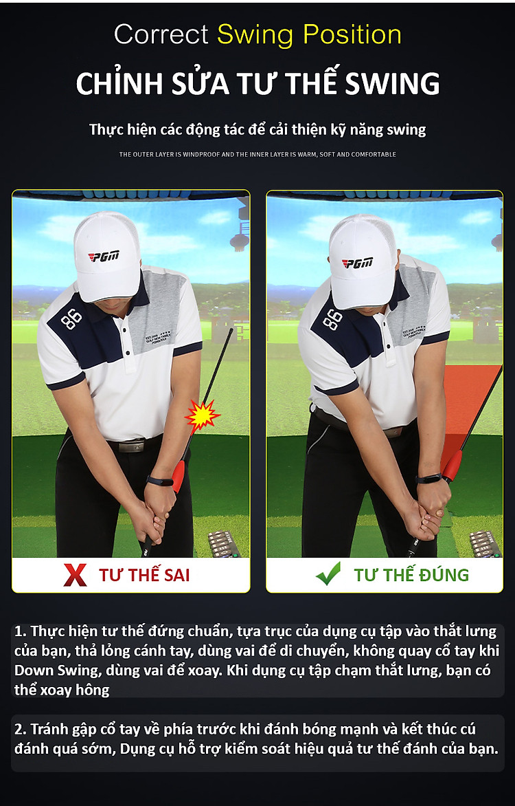 - Dụng cụ sửa tư thế cho người mới chơi sẽ giúp các Golfer sửa tư thế để tay sai trong lúc thực hiện cú đánh Swing.
