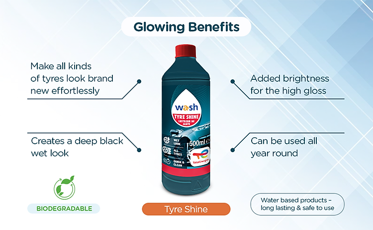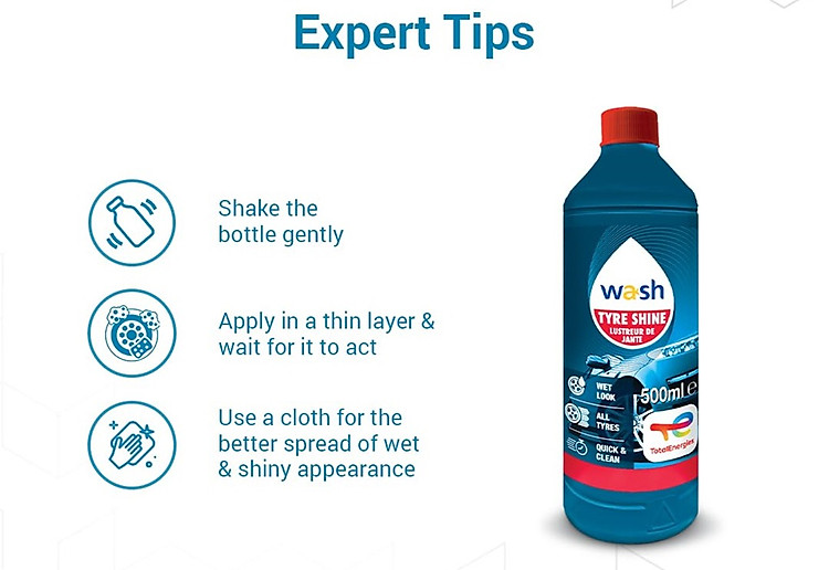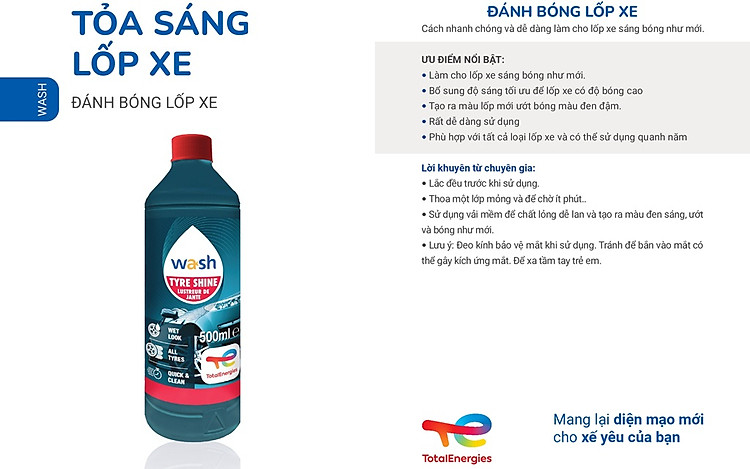 Dung dịch đánh bóng và bảo dưỡng lốp ô tô Total Energies TE-TS500 500ml thấm sâu vào bề mặt và để lại lớp bảo vệ lâu dài. Làm mới màu và làm cho nó trông như mới. Bảo vệ hiệu quả khỏi bụi bẩn, ảnh hưởng của thời tiết, lão hóa sớm và nứt nẻ, cũng như ảnh hưởng của ozone và sự phai màu do tia UV. Thích hợp cho mọi loại lốp xe ô tô.