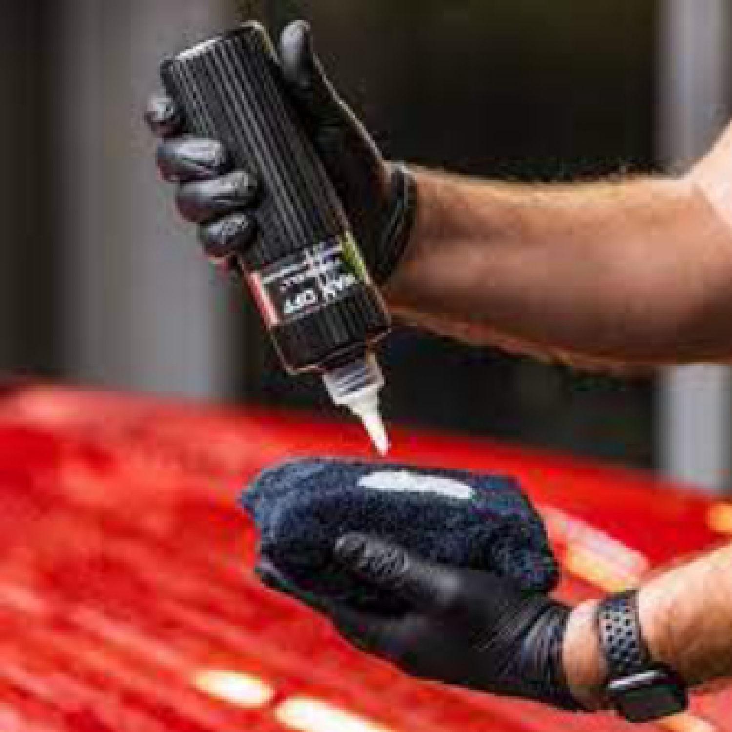 - Đeo găng tay, bóp một lượng Wax Off vừa phải lên miếng bọt hoặc khăn microfiber.