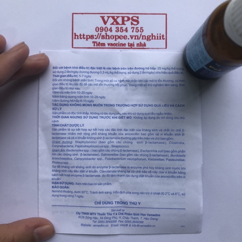 Pha Pet Amox Plus với 15 ml nước cất và lắc đều đến khi tan tạo thành hỗn dịch sau đó cho chó mèo uống. (Sau khi pha nếu vật nuôi không dùng hết có thể bảo quản trong ngăn mát tủ lạnh trong vòng 1 tuần) -------------------- LIỀU DÙNG