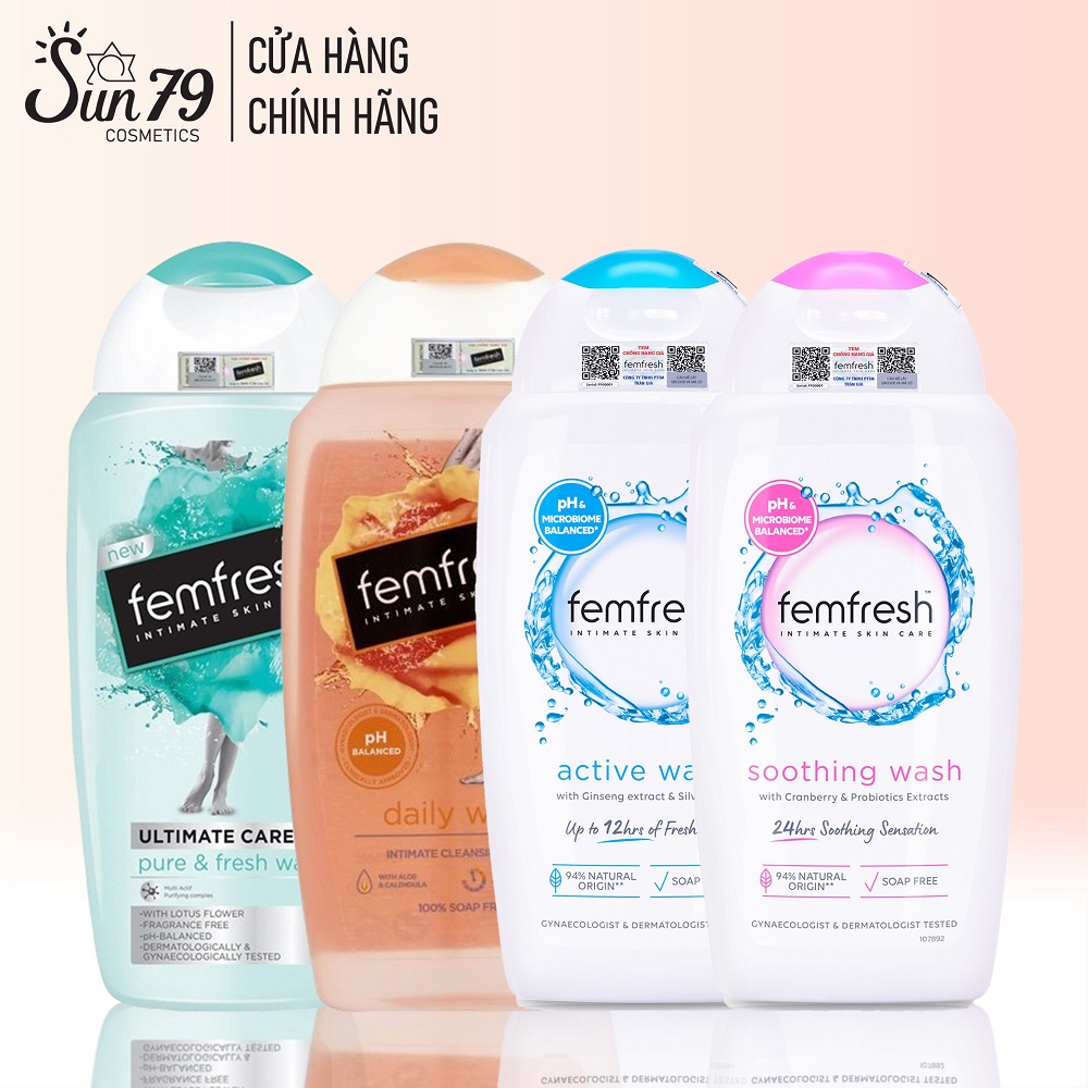 **Thành phần : - Femfresh Wash Gel không chứa xà phòng. - Làm dịu mướt da, mang lại mùi thơm nhẹ nhàng, tinh khiết và gợi cảm cho “cô bé” với chiết xuất từ lô hội và hoa cúc La Mã. - Chất gel trong dịu nhẹ. Đã được kiểm nghiệm phụ khoa (gynaecologically tested) và da liễu (dermatologically tested), an toàn và không gây dị ứng dù là làn da nhạy cảm nhất. Các mẹ bầu, mẹ đang cho con bú yên tâm tuyệt đối khi dùng nhé!