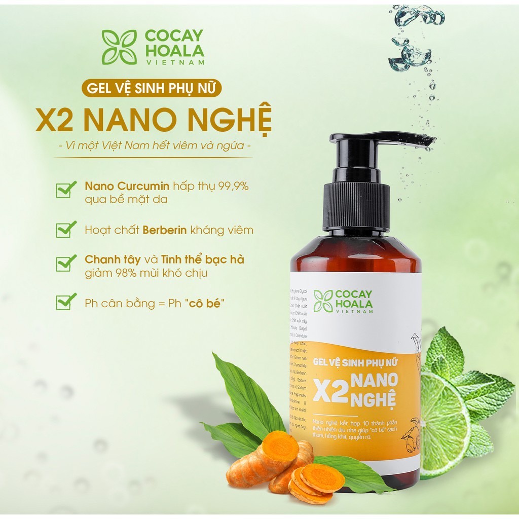 Dung dịch vệ sinh phụ nữ Giảm Ngứa Gel X2 Nano Nghệ Cỏ Cây Hoa Lá 150 ml 1.. Thành phần gel vệ sinh phụ nữ X2 Nano nghệ: - Nano nghệ