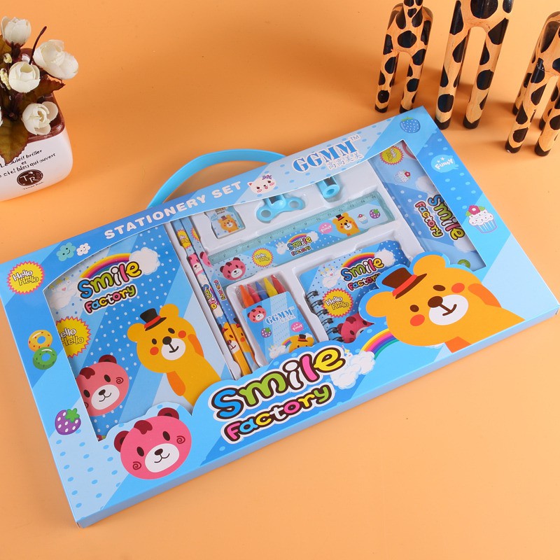 Bao gồm : 1 hộp đựng bút, 1 sổ tay mini, 1 quyển vở nhỏ, 2 bút chì, 2 gọt bút chì, 1 tẩy bút chì, 1 thước kẻ và một bộ 5 bút màu.