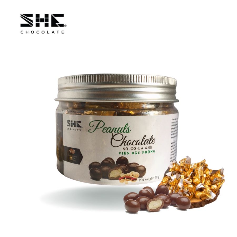 SÔ-CÔ-LA SHE VIÊN ĐẬU PHỘNG Peanuts Chocolate Socola Đậu phộng to, tròn đều. Đậu phộng sau khi rang chân không màu vàng tươi, có vị ngọt nhẹ, bùi, thơm và độ giòn đặc biệt. Kết hợp cùng socola đen SHE, socola tan trong miệng cùng âm thanh rồm rộp giòn tan của đậu phộng. Socola viên Đậu phộng được đóng gói trong giấy bạc tiện dụng, thuận lợi mang theo mỗi khi đi xa hay dành làm quà tặng.