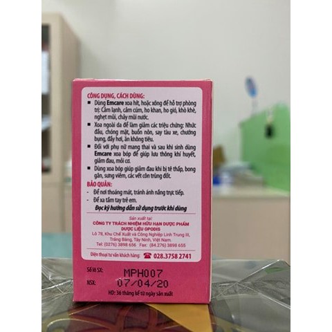 Hướng Dẫn Sử Dụng - Trẻ em dưới 06 tuổi: Dùng cho cảm cúm, cảm lạnh, khò khè, ngẹt mũi, chảy mũi nước: Xoa EMCARE ngày 3-4 lần lên mũi, vùng cổ, ngực, lưng. Bôi xoa vào các vết sưng, viêm, trầy xước do té ngã, vết côn trùng đốt. Phòng các bệnh do nhiễm khuẩn hô hấp trên: Xoa EMCARE vào mũi, gan bàn chân, vùng cổ, ngực, lưng và hai bên thái dương cho em bé sau khi tắm hoặc buổi sớm khi thức dậy. - Trẻ em trên 6 tuổi, sản phụ và người lớn: Giảm cảm cúm, cảm lạnh, ngẹt mũi, sổ mũi: Nhỏ 3-5 giọt EMCARE vào khăn giấy hoặc lòng bàn tay, đưa vào gần mũi và hít sâu. Hoặc pha 15-20 giọt vào chậu nước ấm để tắm hoặc xông hơi khi bị cảm lạnh, cảm cúm. Phòng cảm cúm, cảm lạnh: Khi bắt đầu thấy các biểu hiện như đau họng, hắt hơi, ho khan chảy mũi nước lập tức hít sâu vào mũi nhiều lần bằng EMCARE hoặc dùng ngón tay sạch chấm EMCARE vào họng. Giảm đau bụng, đầy hơi, chống co thắt: Xoa EMCARE vào bụng hoặc pha 3-4 giọt EMCARE vào 100ml nước ấm để uống. Xoa EMCARE vào các vùng sưng viêm, vết thương do trầy xước, vết thương do côn trùng đốt.