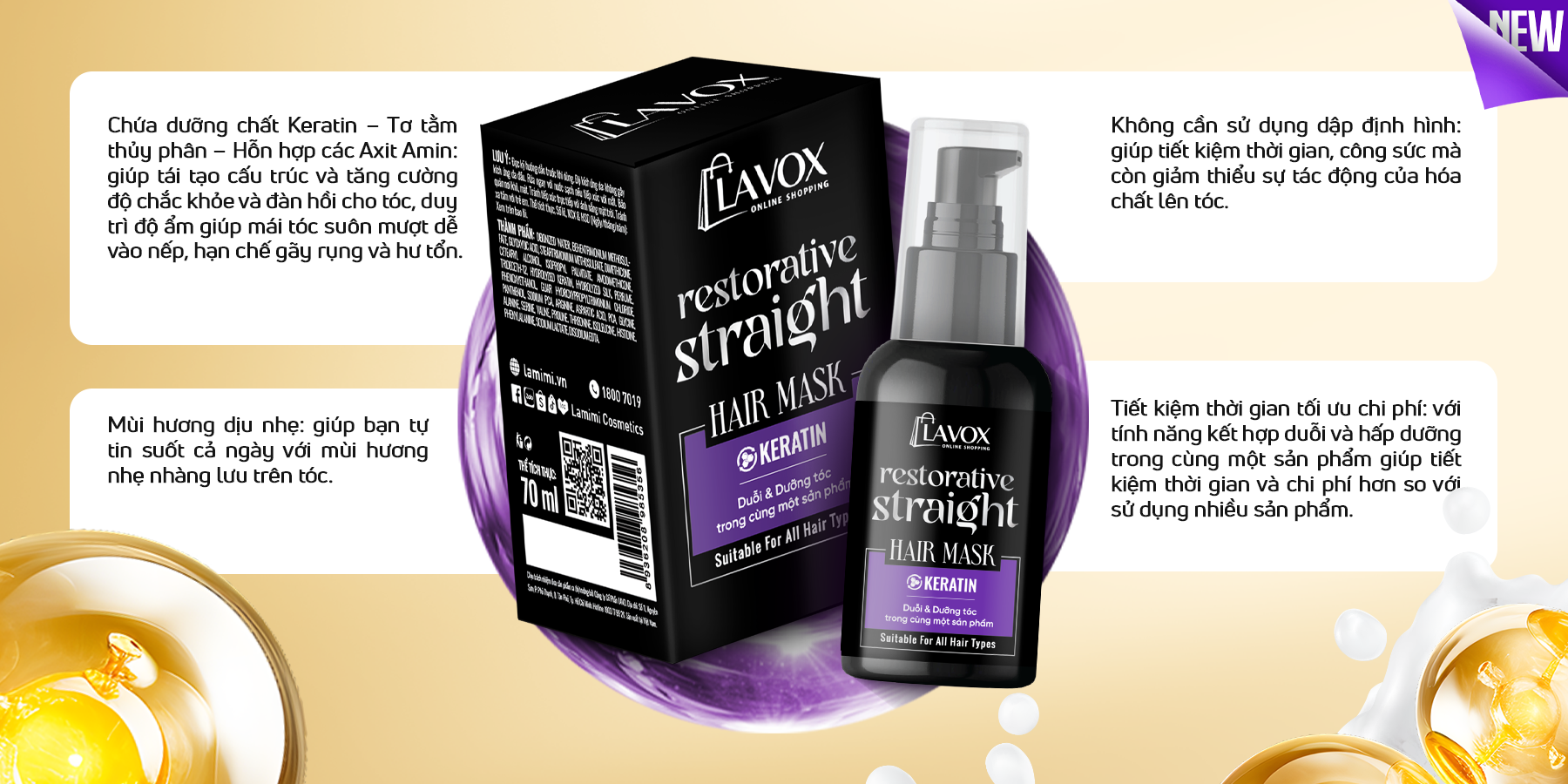 Keratin: dưỡng chất quan trọng giúp tái tạo cấu trúc tóc, tăng cường độ chắc khỏe và đàn hồi cho tóc. Khi tóc được bổ sung Keratin, những hư tổn trên tóc sẽ được lấp đầy, mái tóc hư tổn sẽ trở nên khỏe mạnh, suôn mượt.