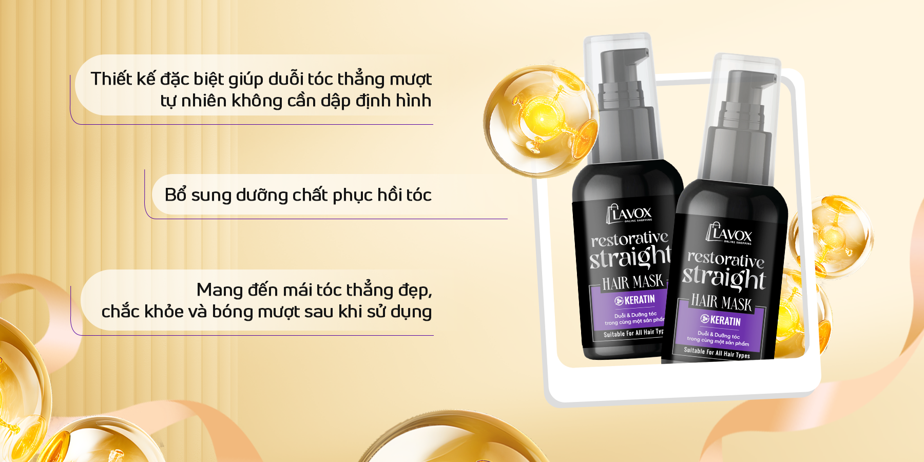 Sản phẩm được thiết kế đặc biệt để giúp duỗi tóc thẳng mượt một cách tự nhiên mà không cần dập định hình, đồng thời hấp bổ sung dưỡng chất phục hồi tóc. Nhờ đó, tóc không chỉ thẳng đẹp mà còn chắc khỏe và bóng mượt hơn sau khi sử dụng.