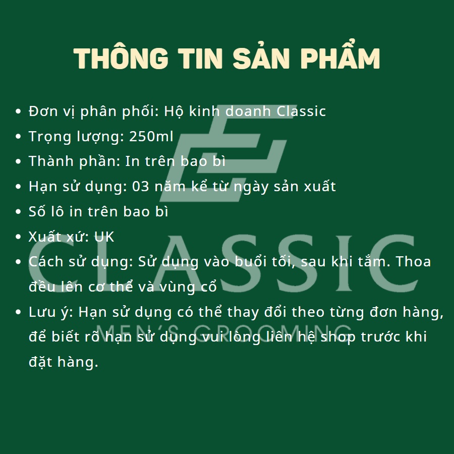 Sữa dưỡng thể làm riêng cho làn da của nam giới, giúp làm giảm đọ khô, cung cấp ẩm, vitamin, dưỡng chất nuôi dưỡng làn da.