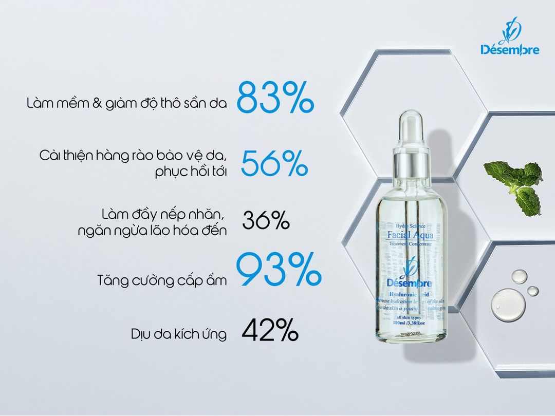 TINH CHẤT HA CẤP ẨM DESEMBRE cô đặc chứa thành phần hyaluronic acid cô đặc giúp tối đa hóa khả năng cung cấp độ ẩm và dưỡng chất đến từng tế bào cho da săn chắc khỏe mạnh,cho da khỏe đẹp từ bên trong, tăng độ đàn hồi và giữ ẩm cho da vượt trội