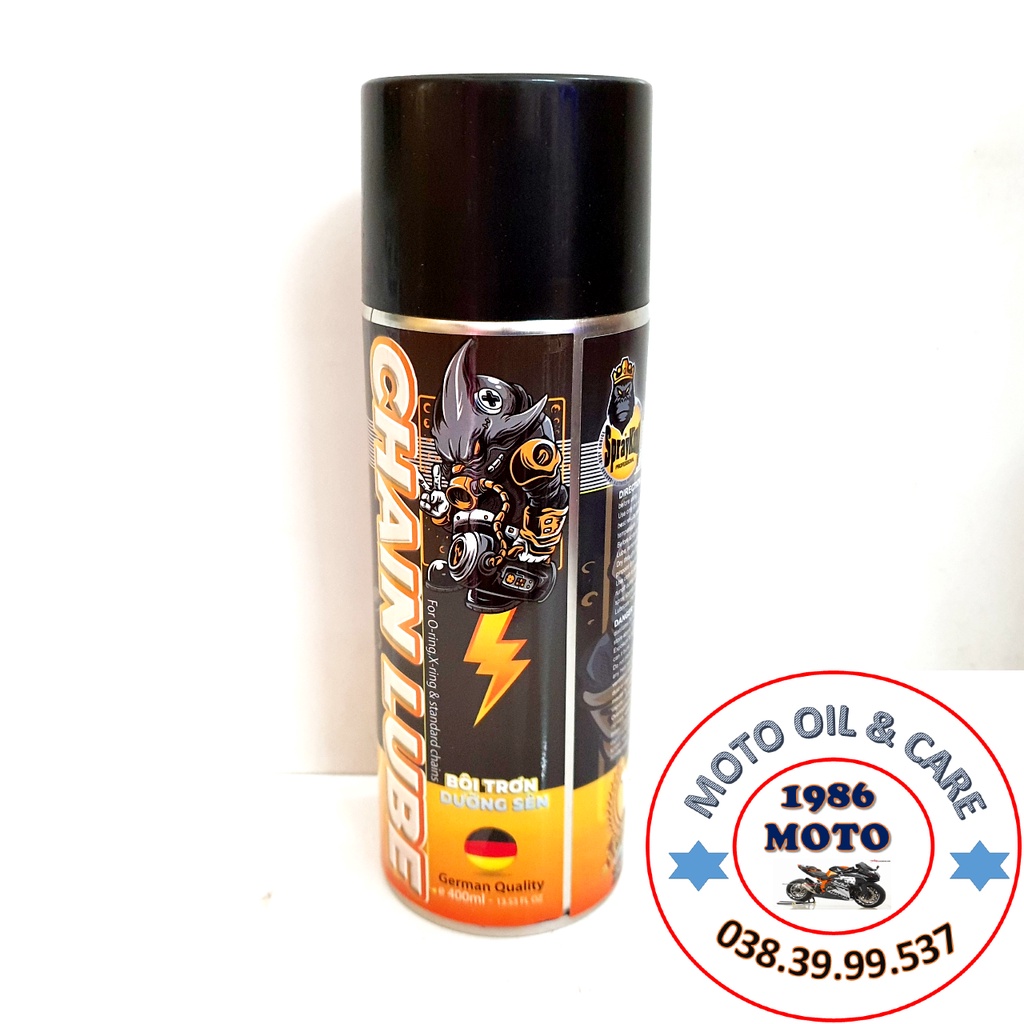 Dưỡng sên Sprayking Chainlube 400ML Chai xịt bôi trơn, dưỡng sên sprayking Chain Lube được thiết kế đơn giản dễ sử dụng, giúp sợi sên vận hành êm ái trên mọi nẻo đường, đồng thời việc bôi trơn sên đúng lúc & liên tục giúp sên giảm hao mòn, gia tăng tuổi thọ sên và giảm chi phí bảo trì bảo dưỡng chiếc xe của bạn. Chai xịt bôi trơn, dưỡng sên sprayking Chain Lube là sản phẩm xịt dưỡng sên cao cấp 100% dầu gốc tổng hợp giúp sên luôn êm ái, chống ồn, kéo dài tuổi thọ của nhông sên dĩa Rửa sên, vệ sinh sên Sprayking 400ml là sản phẩm chất lượng cao của Sprayking. Rửa sên, vệ sinh sên Sprayking sử dụng cho sên thường và sên phốt cao su từ lớn đến nhỏ