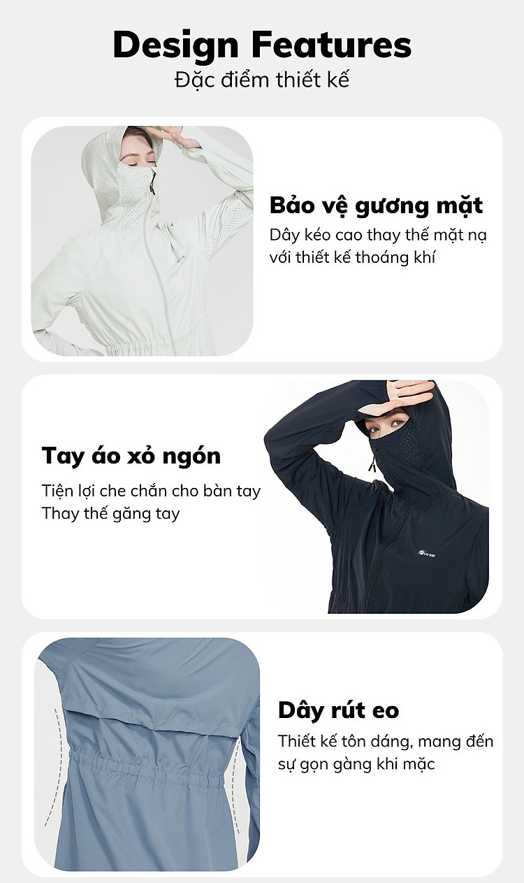 | UV Cut - Chống tia UV | Moisture Wicking - Hút ẩm nhanh khô | Cool Touch - Làm mát da |