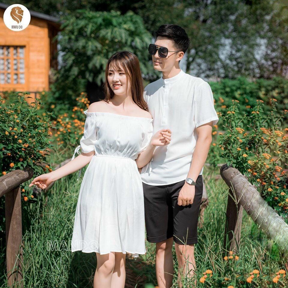 Giới thiệu [Freeship] Set đồ đôi couple sơ mi nam - đầm nữ trễ vai thích hợp du lịch, chụp hình cưới thời trang Noble TN19 (Ảnh thậ