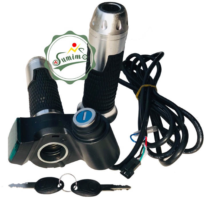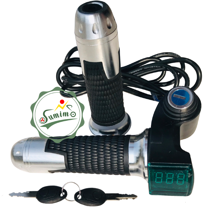 - Thông số kỷ thuật: Tay nắm nhựa, bọc gù nhôm CNC, tích hợp khoá 1 nấc hoặc 2 nấc(dùng cho đèn pha), có đồng hồ báo nấc bình. Tay ga có 3 dây: dây đỏ điện dương 5 Volt, dây đen điện âm, dây xanh lá dây điều khiển. Nếu loại khoá 1 nấc thì có thêm 2 dây ổ khoá(1 dây vào và 1 dây ra ổ khoá). Nếu khoá 2 nấc thì có thêm 3 dây (1 dây vào ổ khoá, 1 dây ra ổ khoá cấp điện cho IC, 1 dây ra đèn pha).