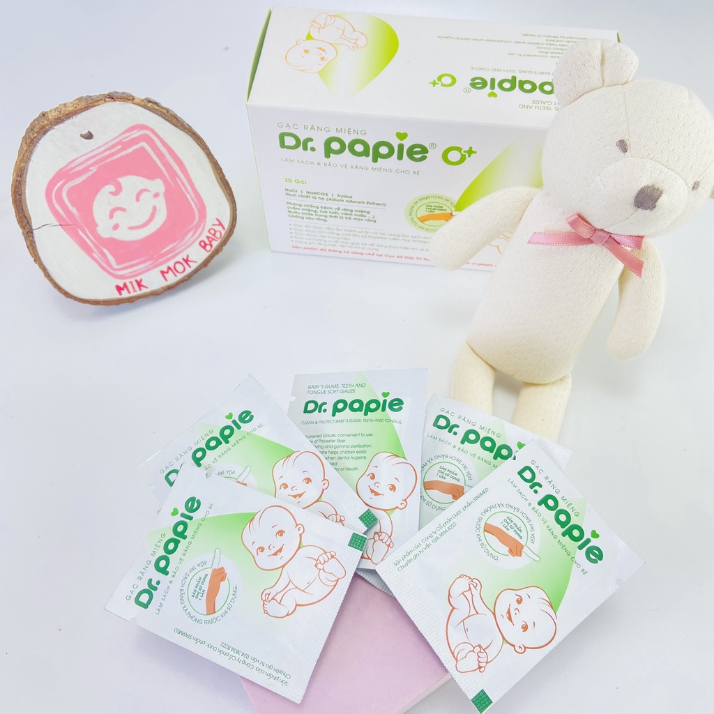 THÀNH PHẦN Gạc dr papie là gạc rơ lưỡi thảo mộc không hề sai vì thành phần chứa lá hẹ, là kháng sinh tự nhiên có tác dụng kháng khuẩn, chứa tưa lưỡi, viêm nướu Gạc rơ miệng là gạc xỏ ngón chứa xylitol làm sạch mảng bám, ngừa sâu răng Gạc làm từ sợi Poloyester mềm mại, không vương sợi bông đã được hấp tiệt trùng bằng tia gamma Chất liệu hình ống,Vừa vặn ngón tay, không gây cộm Được đóng gói riêng lẻ và tiệt trùng bằng tia Gamma nên an toàn tuyệt đối với sức khỏe của bé.