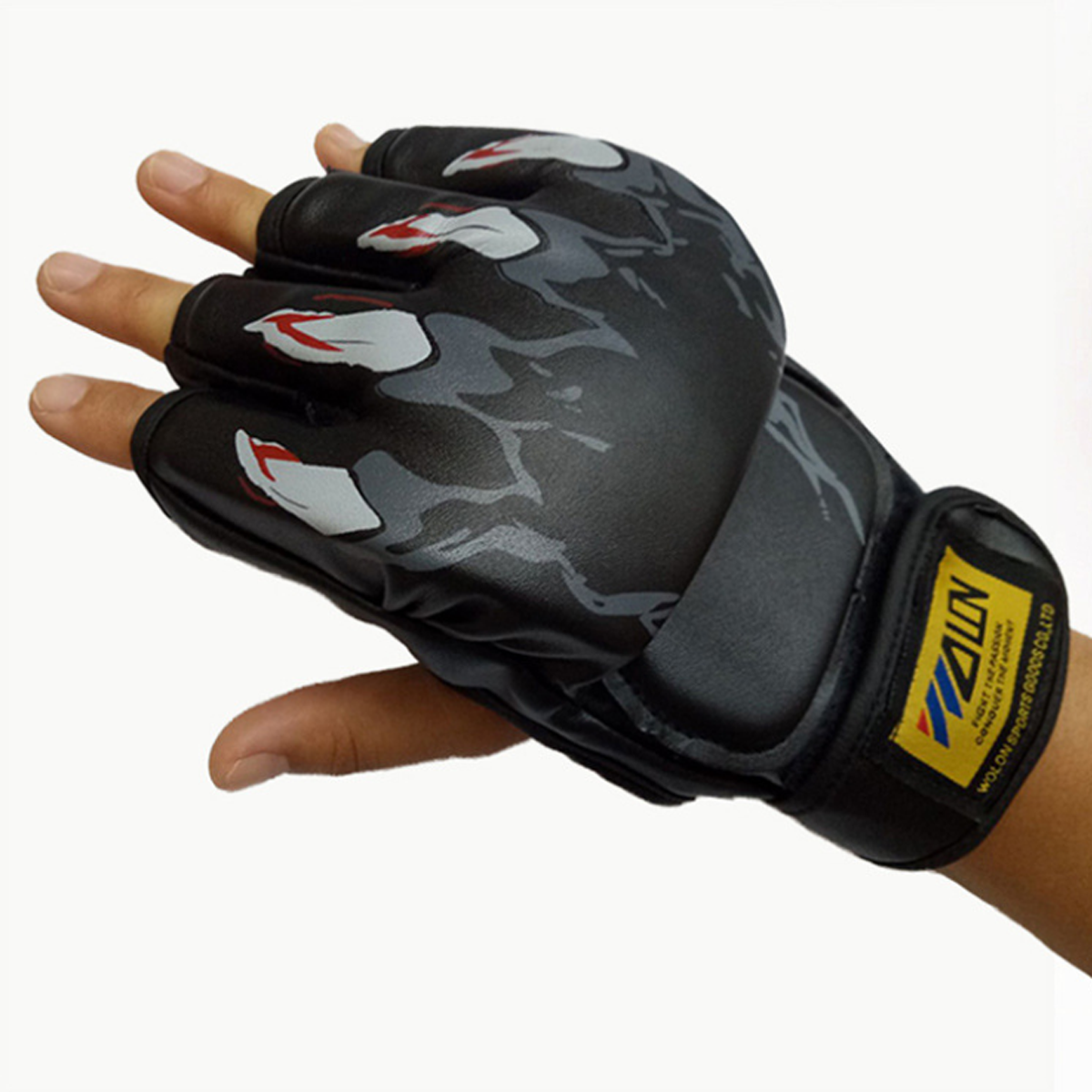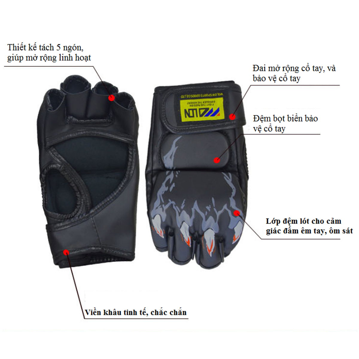 Găng tay MMA Wolon hở ngón được làm từ chất liệu da PU bền chắc, đệm mút lót cao cấp, đàn hồi tốt, dai và độ bền cao.