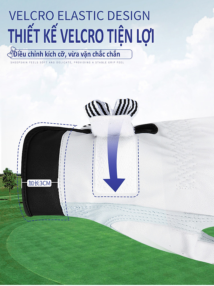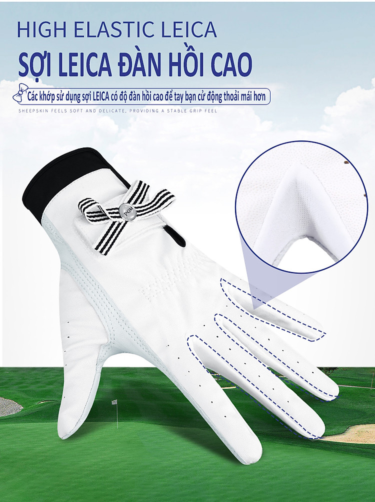 - Găng tay thể thao tiên tiến: Được làm bằng vải Microfiber giúp Golfer cảm thấy mềm mại và thoải mái khi đeo, chống bụi bẩn.