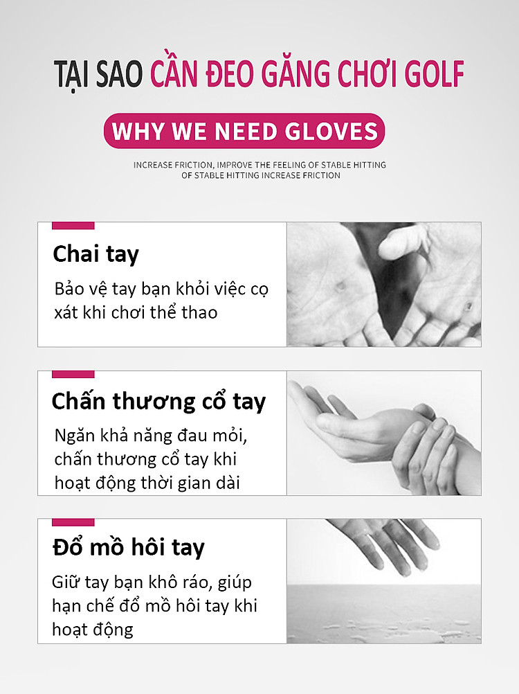 Trong golf, 3 loại chấn thương phổ biến nhất là: bong da, bong gân, trật khớp cổ tay. Phần lớn là do người chơi đánh sai kĩ thuật, nhưng một tác nhân ít ai ngờ đến đó là do không đeo găng tay khi chơi. Một đôi găng tay tốt sẽ góp phần giúp cho người chơi hạn chế chấn thương, đánh ổn định hơn và tự tin thực hiện những cú đánh ghi điểm.