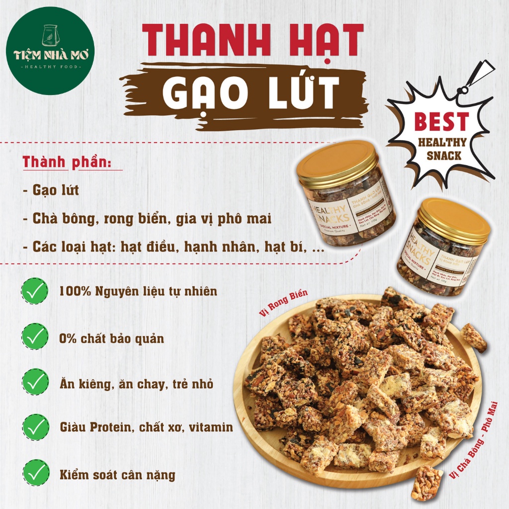 THANH GẠO LỨT NGŨ CỐC - THANH NĂNG LƯỢNG bổ sung dinh dưỡng tối đa : 💯 Sản phẩm được nghiên cứu kỹ lưỡng với công thức độc quyền, đảm bảo không đụng hàng, hương vị thơm ngon, siêu giòn, không ngọt. 💯 Thanh gạo lứt ngũ cốc với thành phần gạo lứt và các loại hạt dinh dưỡng, cung cấp nhiều khoáng chất và vitamin cho khẩu phần ăn. 💯 Giúp cân đối dinh dưỡng, tốt cho sức khỏe. Sản phẩm bổ sung chất đạm và chất xơ, đủ chất cho người đang ăn kiêng, giảm cân. Tốt cho tim mạch, người mắc bệnh huyết áp. 💯 Thích hợp sử dụng làm bữa ăn họp mặt, ăn vặt hay làm quà tặng người thân, bạn bè, gọn nhẹ, thơm ngon phù hợp với mọi lứa tuổi. Có thể mang đi xa, du lịch & picnic, ăn vặt văn phòng,... 💯100% nguyên liệu healthy, không chứa chất bảo quản. Bạn có thể hoàn toàn yên tâm sử dụng hằng ngày. --------- 👨🏻🌾 Thành phần: 1. 𝗧𝗵𝗮𝗻𝗵 𝗴𝗮̣𝗼 𝗹𝘂̛́𝘁 𝗰𝗵𝗮̀ 𝗯𝗼̂𝗻𝗴, 𝗽𝗵𝗼̂ 𝗺𝗮𝗶: gạo lứt, hạt điều, hạnh nhân, hạt bí, chà bông, gia vị phomai, đường trái cây (fructose), gelatin 2. 𝗧𝗵𝗮𝗻𝗵 𝗴𝗮̣𝗼 𝗹𝘂̛́𝘁 𝘃𝗶̣ 𝗿𝗼𝗻𝗴 𝗯𝗶𝗲̂̉𝗻: gạo lứt, hạt điều, hạnh nhân, hạt bí, rong biển, gia vị rong biển, bột creamer, đường trái cây (fructose), gelatin ✅ Dùng trực tiếp, sử dụng ngay khi mở túi để đảm bảo chất lượng tốt nhất. ✅ Ăn liền, chấm sữa hoặc ăn kèm với mứt trái cây và sữa chua ✅ HSD: 6 tháng. Không dùng chất bảo quản. ✅Bảo quản nơi khô ráo, thoáng mát, nhiệt độ phòng. Có thể bảo quản ở ngăn mát tủ lạnh để bánh giòn lâu hơn và không bị ỉu, mốc. --------- ⭕️ Lưu ý ⭕️ - Shop đã bọc rất kỹ nhưng không tránh khỏi trong quá trình vận chuyển sản phẩm có thể bị bể 1 chút, mong bạn thông cảm giúp shop ạ. - Bạn nhớ dùng ngay sau khi mở túi để đảm bảo dưỡng chất và hương vị thơm ngon của sản phẩm nhé! ------- CAM KẾT 1. Không Chất Bảo Quản 2. Không Đường Hóa Học và Chất Phụ Gia 3. Được Chứng Nhận Đảm Bảo Vệ Sinh An Toàn Thực Phẩm 4. Hỗ trợ đổi trả nếu phát hiện sản phẩm có vấn đề về chất lượng như: yểu, bị hôi dầu, bị mốc. ------- Tiệm nhà Mơ - Healthy Food Đ/c: 572/40 Âu Cơ, P.10, Q. Tân Bình, TP. HCM