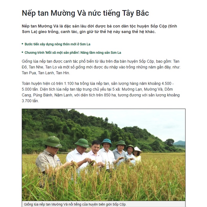 1. Giới thiệu Nếp tan Mường Và Nếp tan Mường Và là giống lúa truyền thống được bà con dân tộc Thái, Lào ở Sốp Cộp (Sơn La) gieo trồng từ lâu, qua thời gian giống lúa vẫn giữ nguyên được giá trị với hương vị dẻo, thơm tự nhiên. Từ ngàn xưa gạo nếp tan đã được người dân sử dụng làm nguyên liệu để chế biến thành các món ăn thường nhật. Đặc biệt, trong các dịp lễ, Tết, gạo còn được sử dụng làm quà để dâng lên tổ tiên. Nếp Tan Mường Và nổi tiếng vì hương vị đậm đà và độ dẻo thơm đặc trưng của nó. Những ai đã từng thưởng thức nắm xôi làm từ loại nếp này dù chỉ một lần cũng sẽ nhớ cả đời về vị thơm ngon khó cưỡng của nó. Giống lúa nếp Tan được bà con dân tộc Thái ở Mường Và lưu giữ từ thế hệ này qua thế hệ khác, nhà nào cũng có từ 1 đến 2 sào ruộng để trồng với nhiều loại giống như Tan Nhe, Tan Hin, Tan Lo. Mường Và có nếp tan - một đặc sản nổi tiếng của vùng. Hương vị đậm đà, độ dẻo thơm đặc biệt của giống nếp tan nơi này khiến du khách khó mà quên