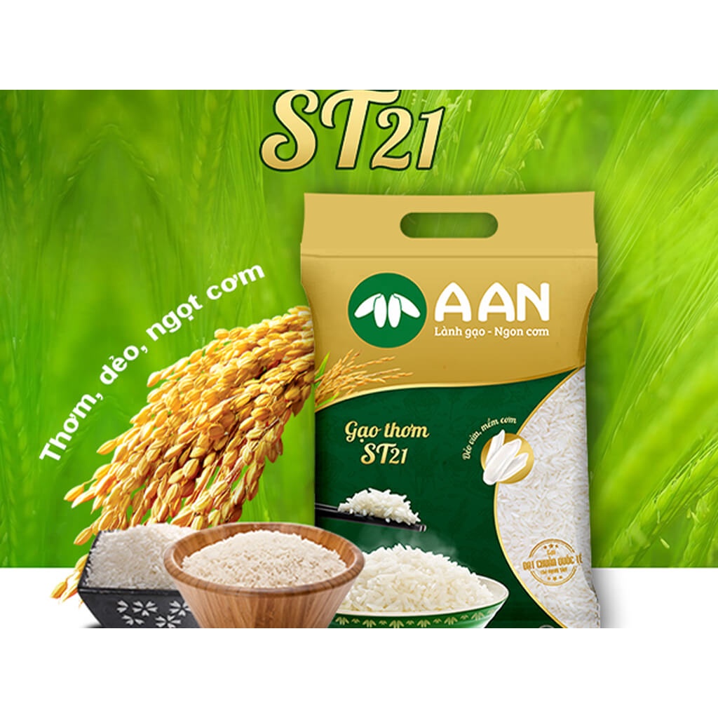 Gạo thơm ST21 A An được thu hoạch từ giống lúa ST21 tự nhiên. Gạo của thương hiệu A An được sản xuất trên dây chuyền hiện đại, cam kết không đấu trộn, không chất tạo mùi, mang lại sản phẩm gạo chất lượng, an toàn cho sức khoẻ người dùng