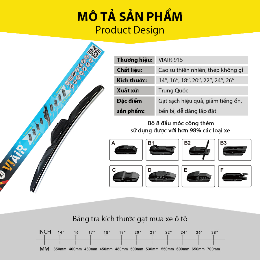 Gạt mưa VIAIR 915 (14 trong 1) (18 inch/450 mm) với thiết kế độc đáo, giúp bám sát bề mặt kính xe trong quá trình gạt, nhờ đó hiệu quả gạt quét trở nên hiệu quả hơn nhưng hoàn toàn không gây nên tiếng ồn hay vết xước trên bề mặt kính chắn gió xe khi sử dung. Sản phẩm được thiết kế với nhiều kích cỡ khác nhau, ngoài ra còn có 8 loại móc kèm theo, đến 14 loại móc treo khác nhau, nhờ đó sản phẩm có khả năng sử dụng cho hơn 98% các loại xe trên thị trường hiện nay.