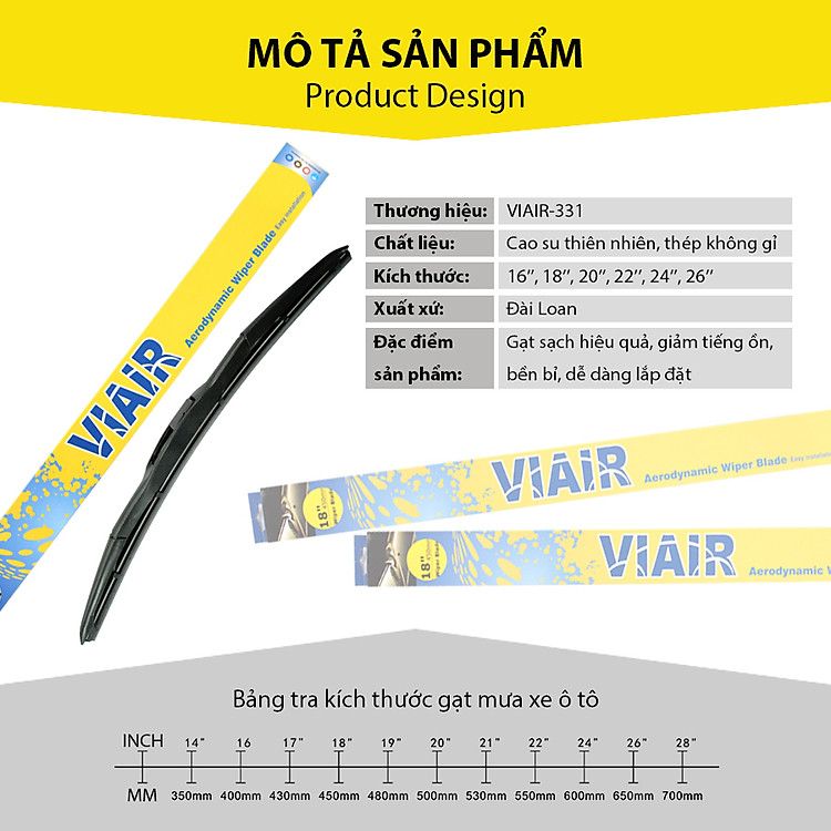 Gạt mưa 3 khúc VIAIR 331 (18 inch/450 mm) có thiết kế 3 khúc tiện lợi giúp làm sạch bề mặt kính một cách hiệu quả với hiệu suất 100% mà không gây tiếng ồn hay làm trầy xước bề mặt kính.