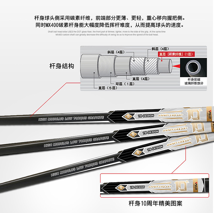 - Thân gậy : Làm bằng Graphite siêu nhẹ, nhằm cải thiện vận tốc do đó dễ dàng hơn để xoay, tốc độ bóng bay xa hơn, có được những cú đánh swing hoàn hảo.