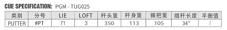 Ra mắt năm 2019, mẫu gậy Putter TUG025 là dòng gậy nằm trong phân khúc bình dân được thiết kế rất tinh tế kết hợp với công nghệ CNC cắt nét mặt gậy (công nghệ hàng đầu trong sản xuất gậy Golf). Đây là dòng sản phẩm phù hợp với nhu cầu của nhiều người chơi Golf.