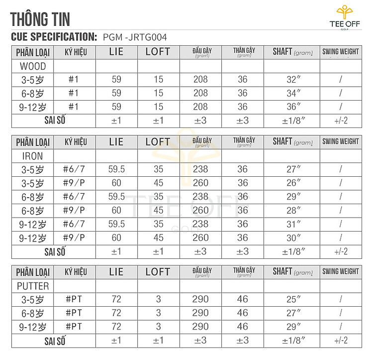 - Được thiết kế chuyên biệt về độ dài, góc Loft... và màu sắc phù hợp với từng lứa tuổi.