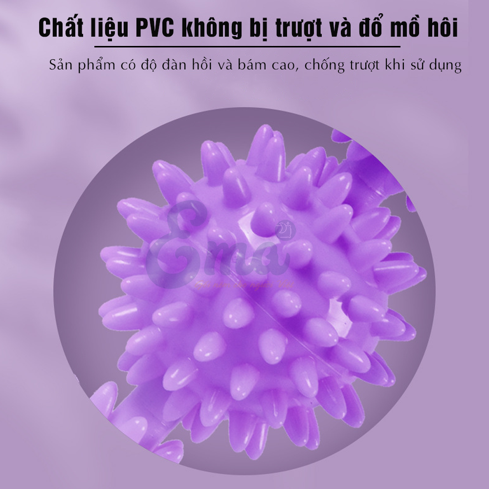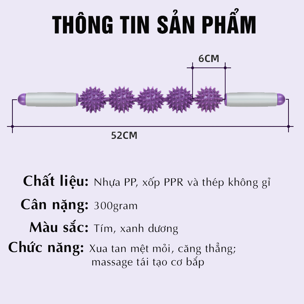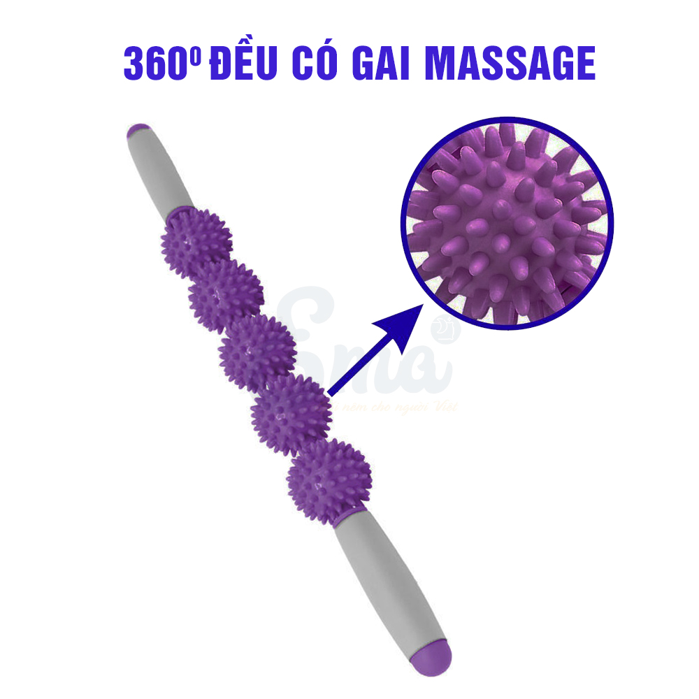 - Cấu tạo gồm 5 bóng gai Massage gắn trên lõi gậy bằng khung thép có 2 tay cầm bọc xốp EVA chắc chắn, bóng gai được làm từ nhựa PVC cứng, đầu gai bo tròn tỉ mỉ giúp Massage chứ không gây đau